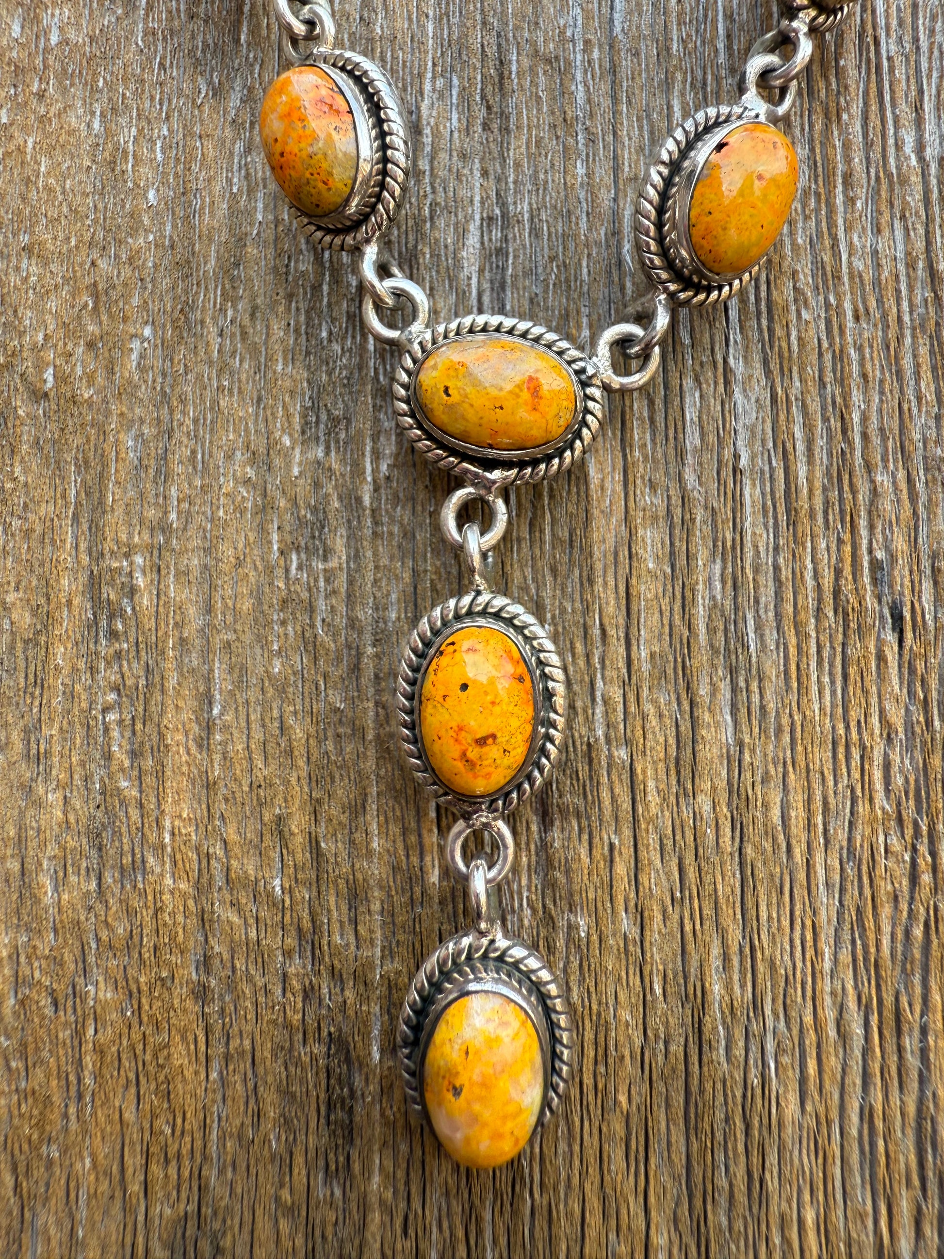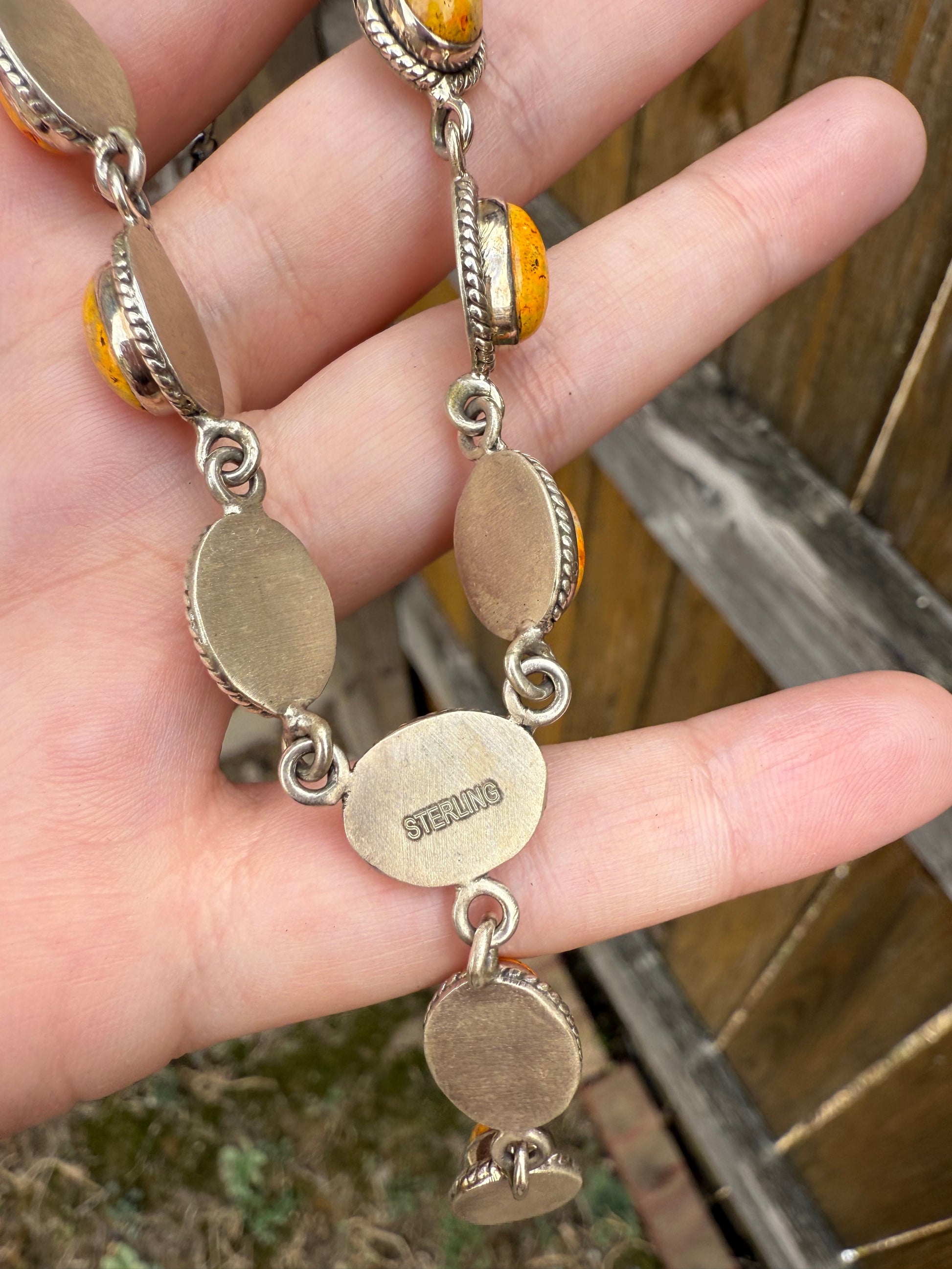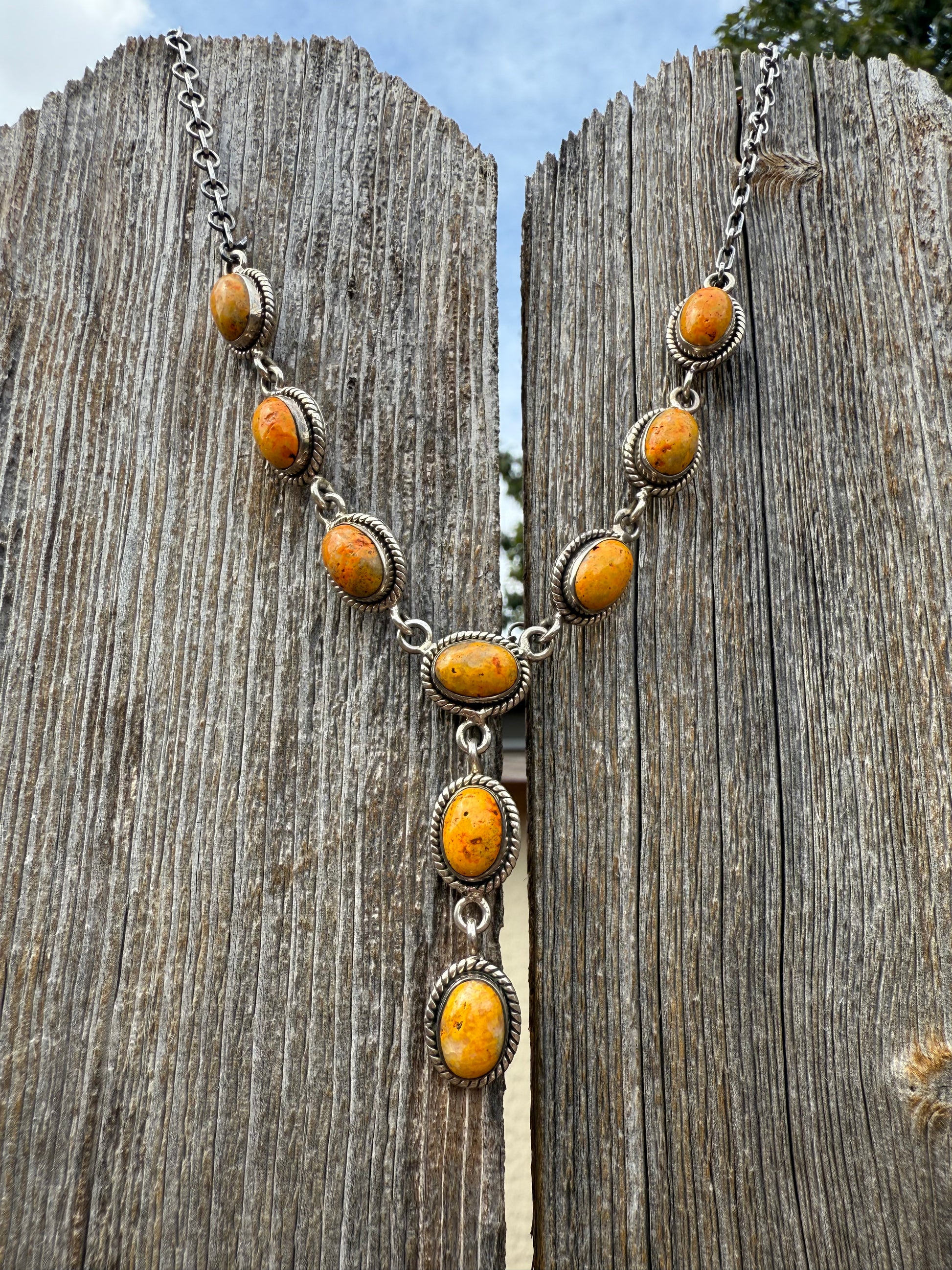 This stunning necklace features vibrant orange stones set in a classic silver design. Perfect for adding a pop of color to any outfit.