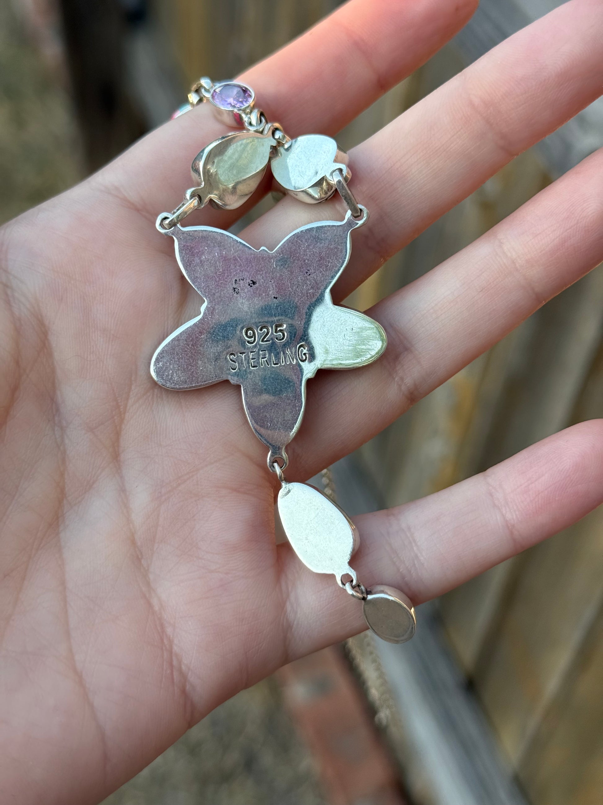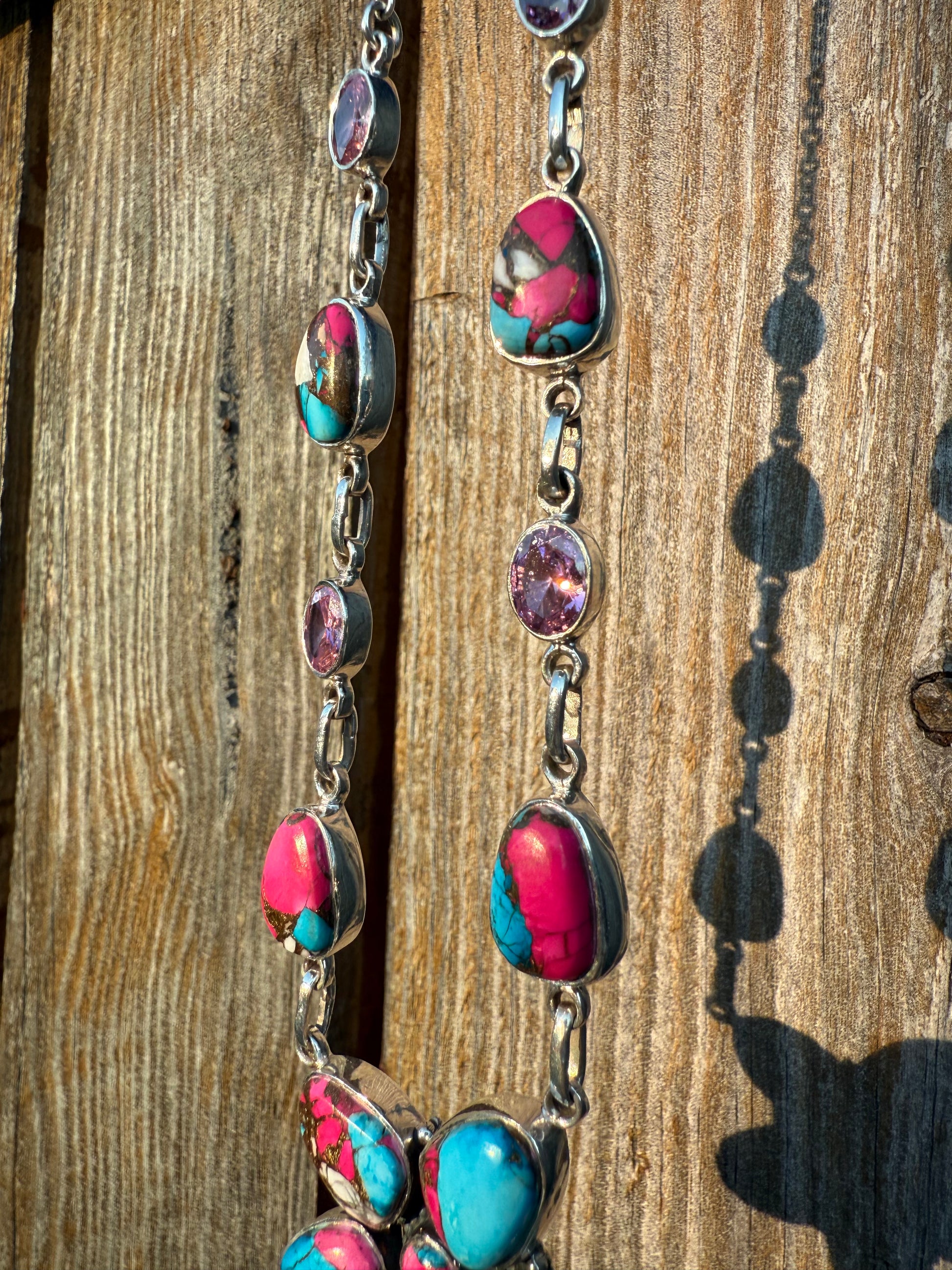 Vibrant necklace with pink and blue stones. Unique design with silver accents.