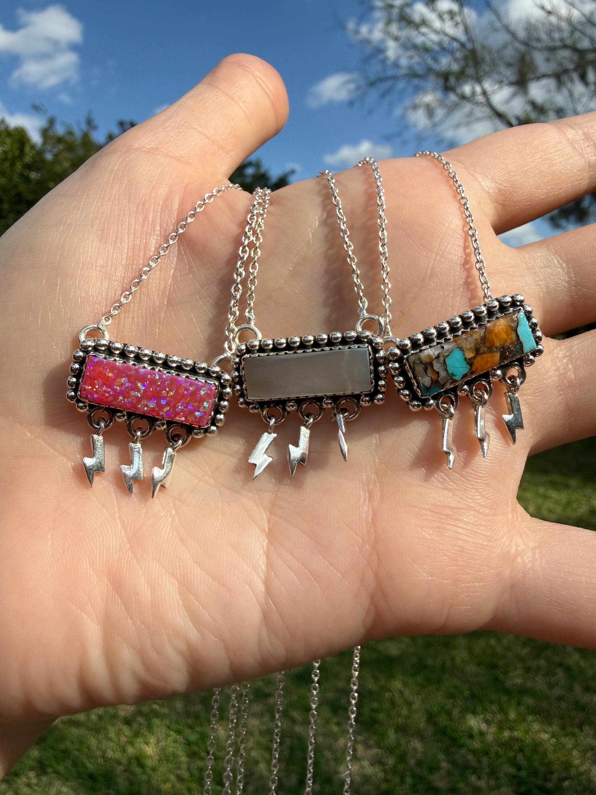 Lightening Bolt Triple Dangle Bar Sterling Silver Gemstone Necklace