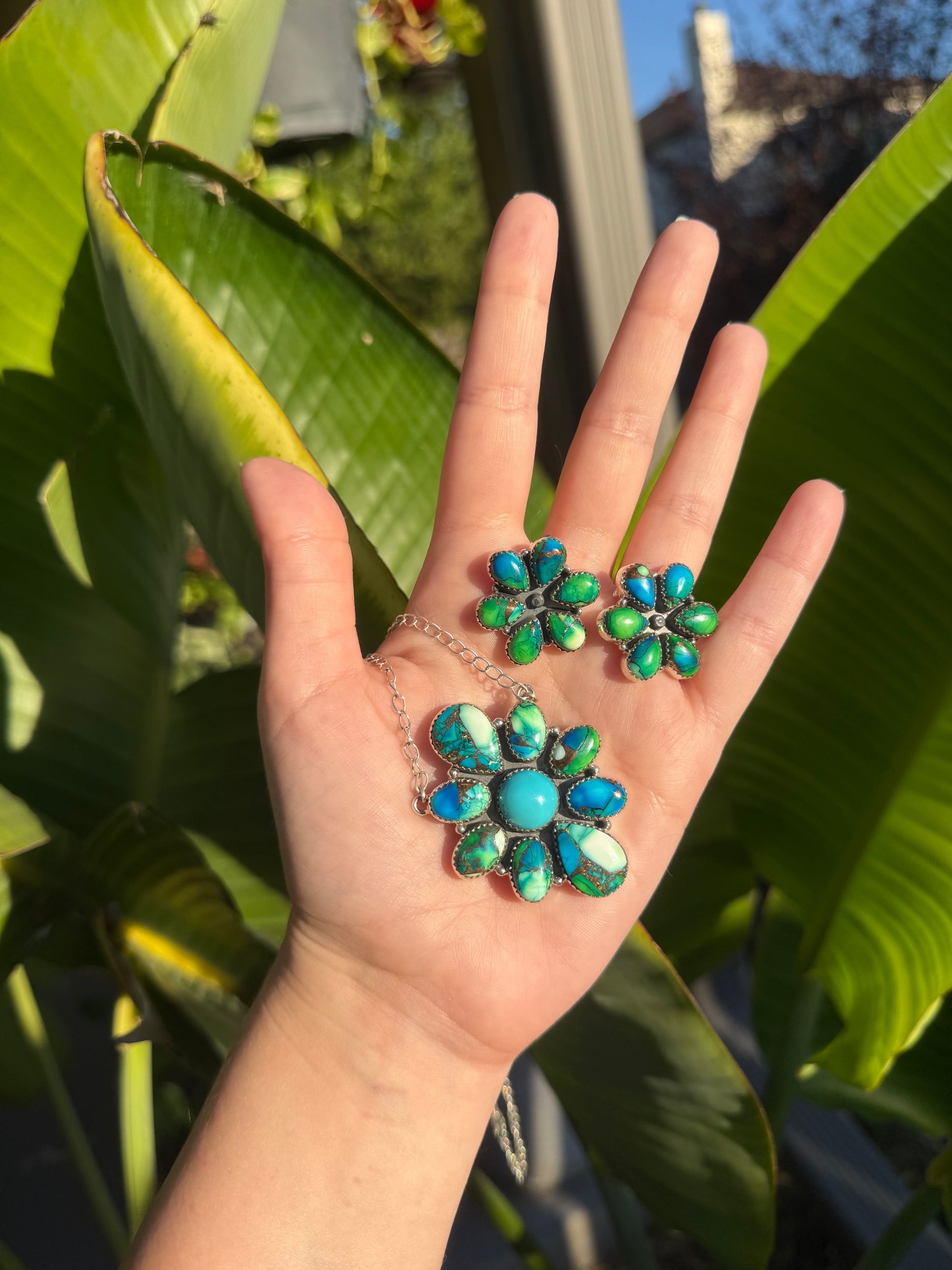 Beautiful necklace featuring turquoise and green stones in a flower design. Perfect for adding a pop of color to any outfit.