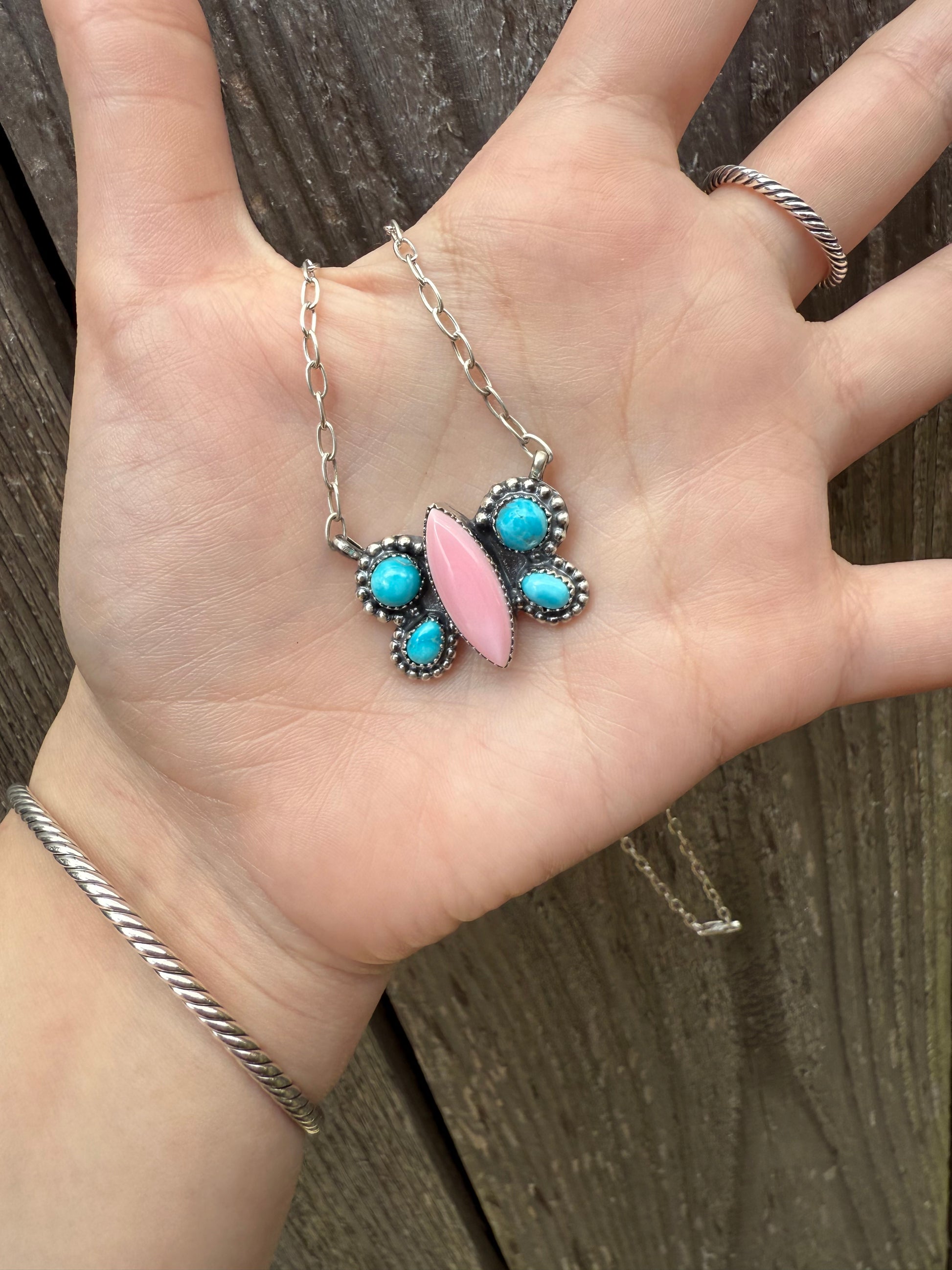 Pink Conch and Blue Bird turquoise butterfly necklace. Sterling silver on 18" sterling chain with lobster clasp. Non-native made, handmade in USA. Stamped MWW, AC, and STERLING.