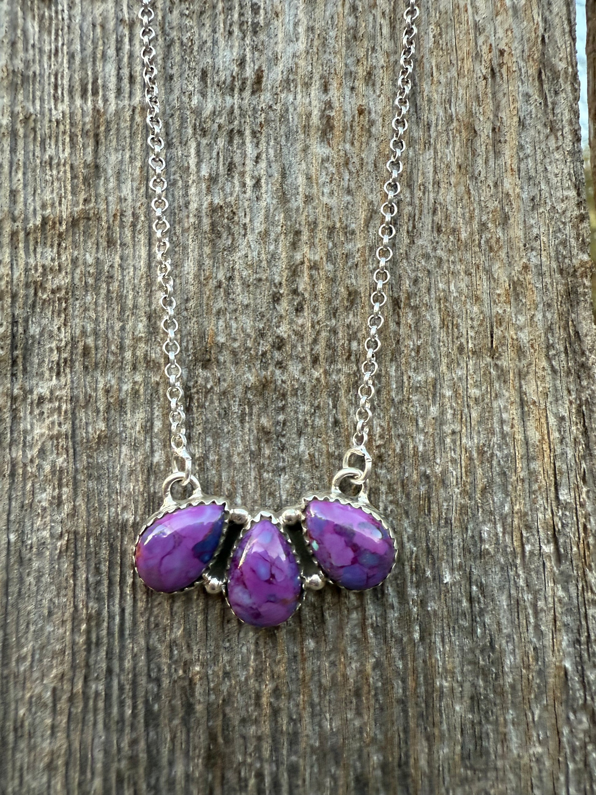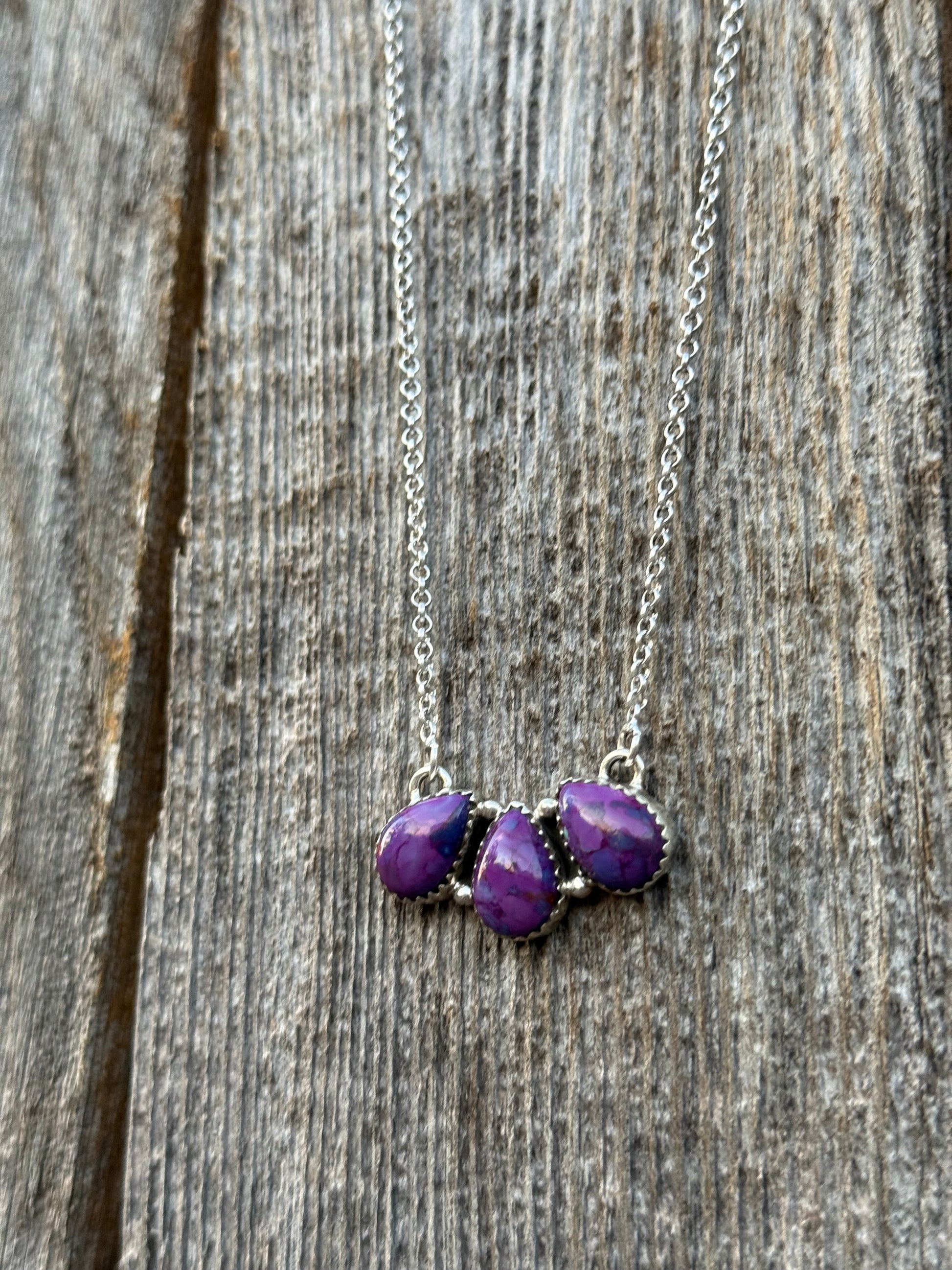 Elegant necklace with three purple teardrop pendants. Silver chain adds a classic touch.