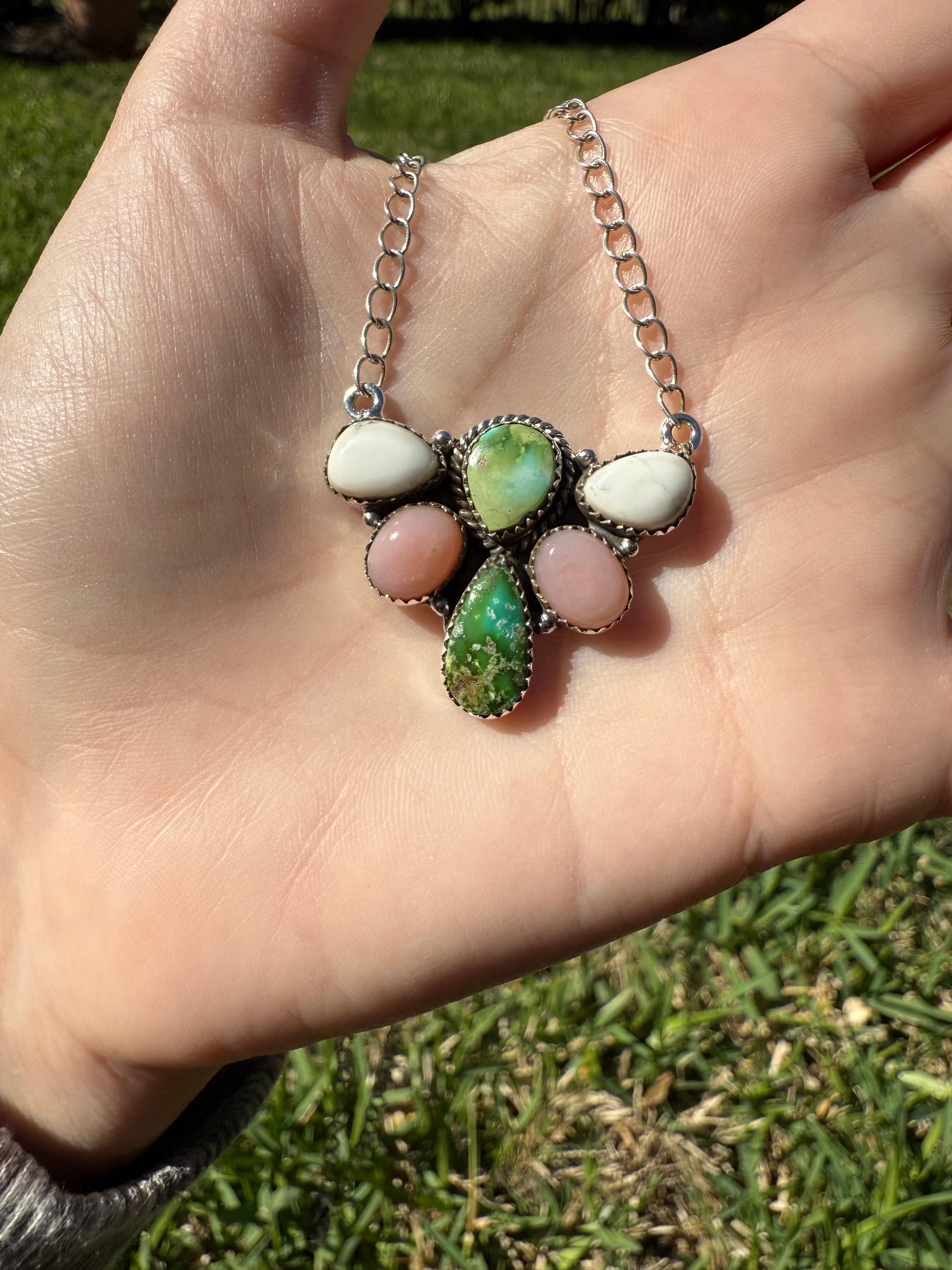 Sonoran Gold Turquoise, Pink Opal, White Buffalo Sterling Silver Necklace