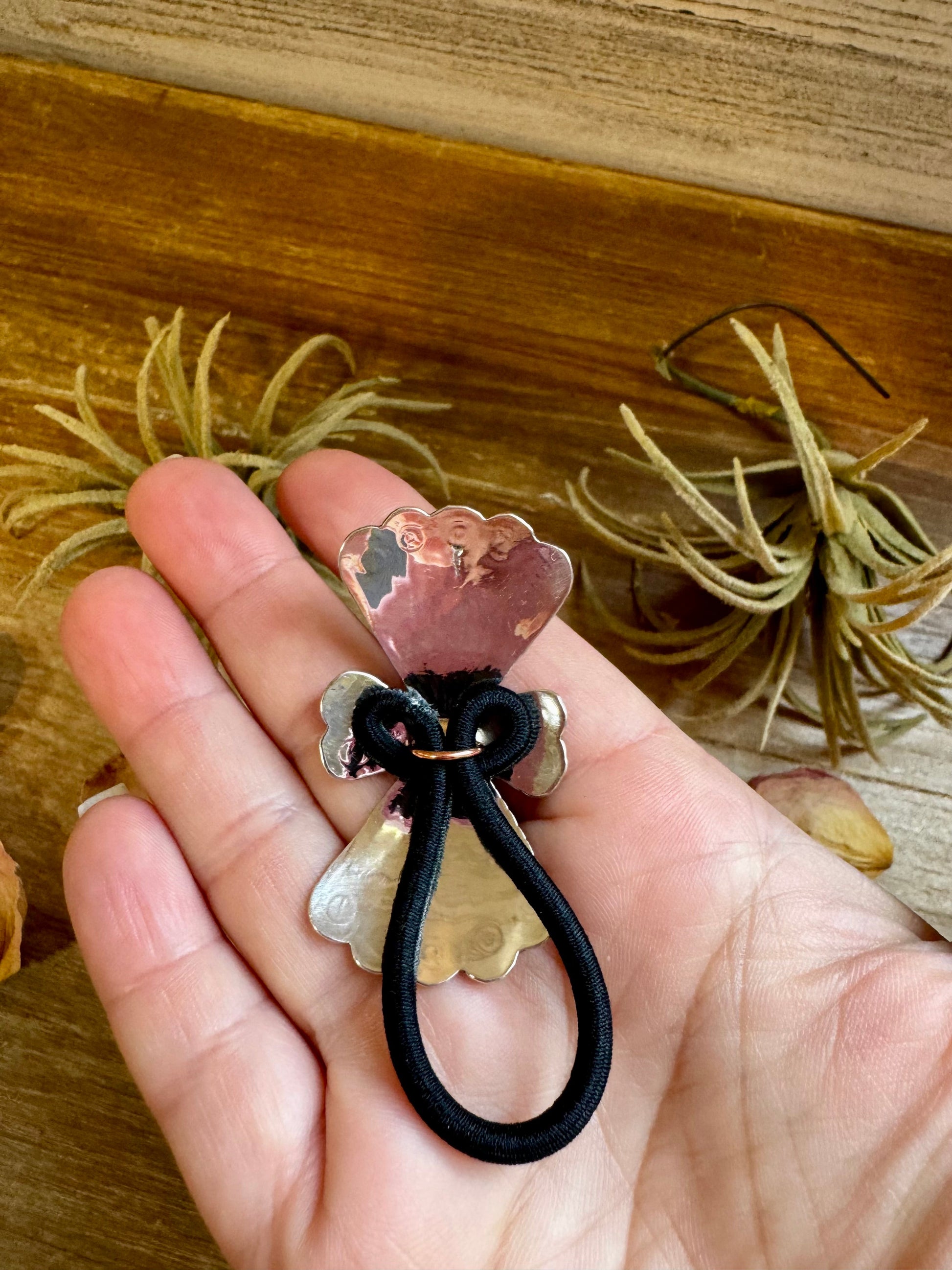 This hair tie is giving style meets strength. A fun, unique shape in sterling silver with a genuine Kingman turquoise stone set right in the middle. Comes on a strong black elastic that holds well but can also be replaced over time if needed. It’s about 2.5 inches long and makes a statement whether you're wearing your hair up or wrapped around a hat.