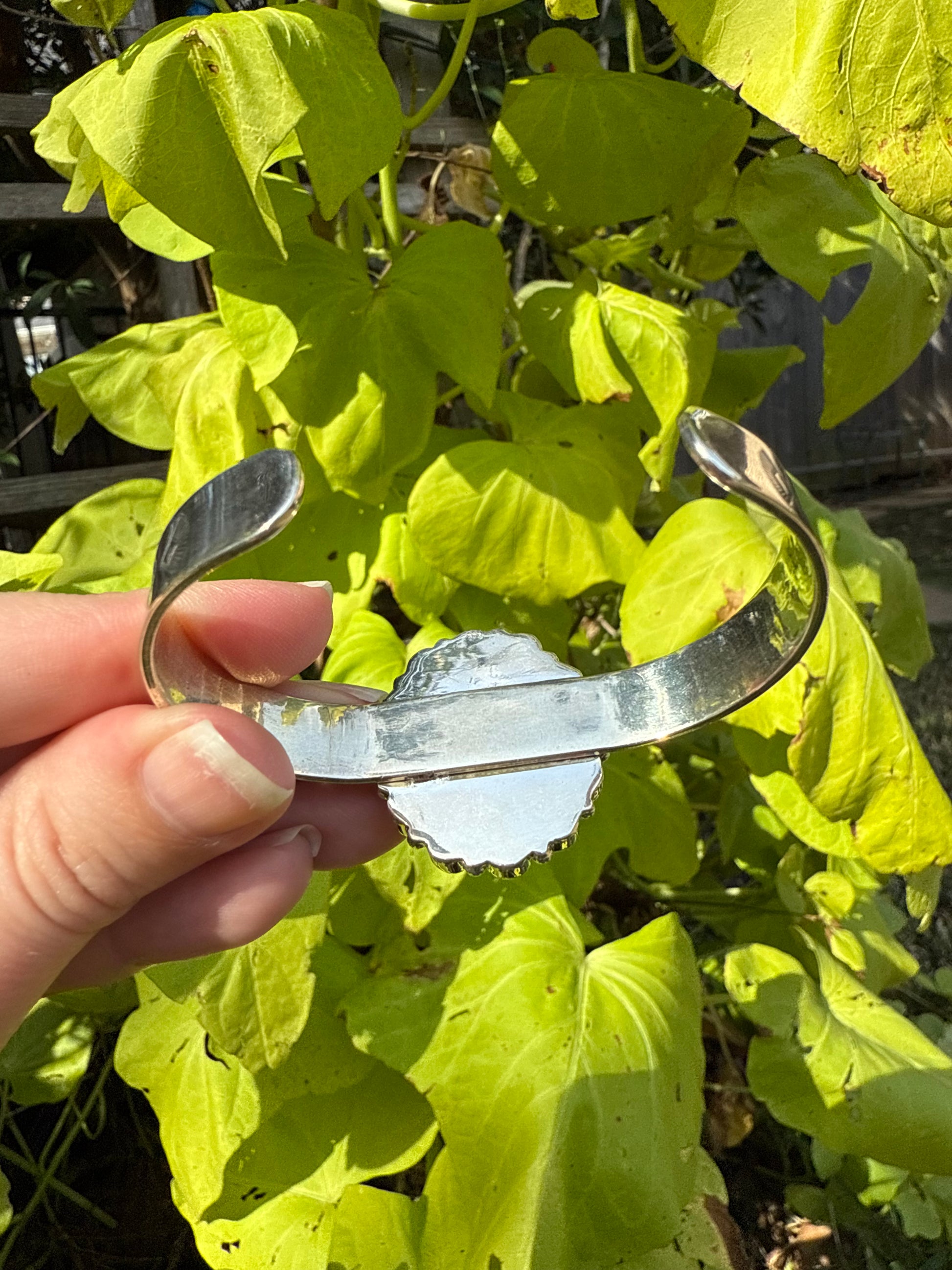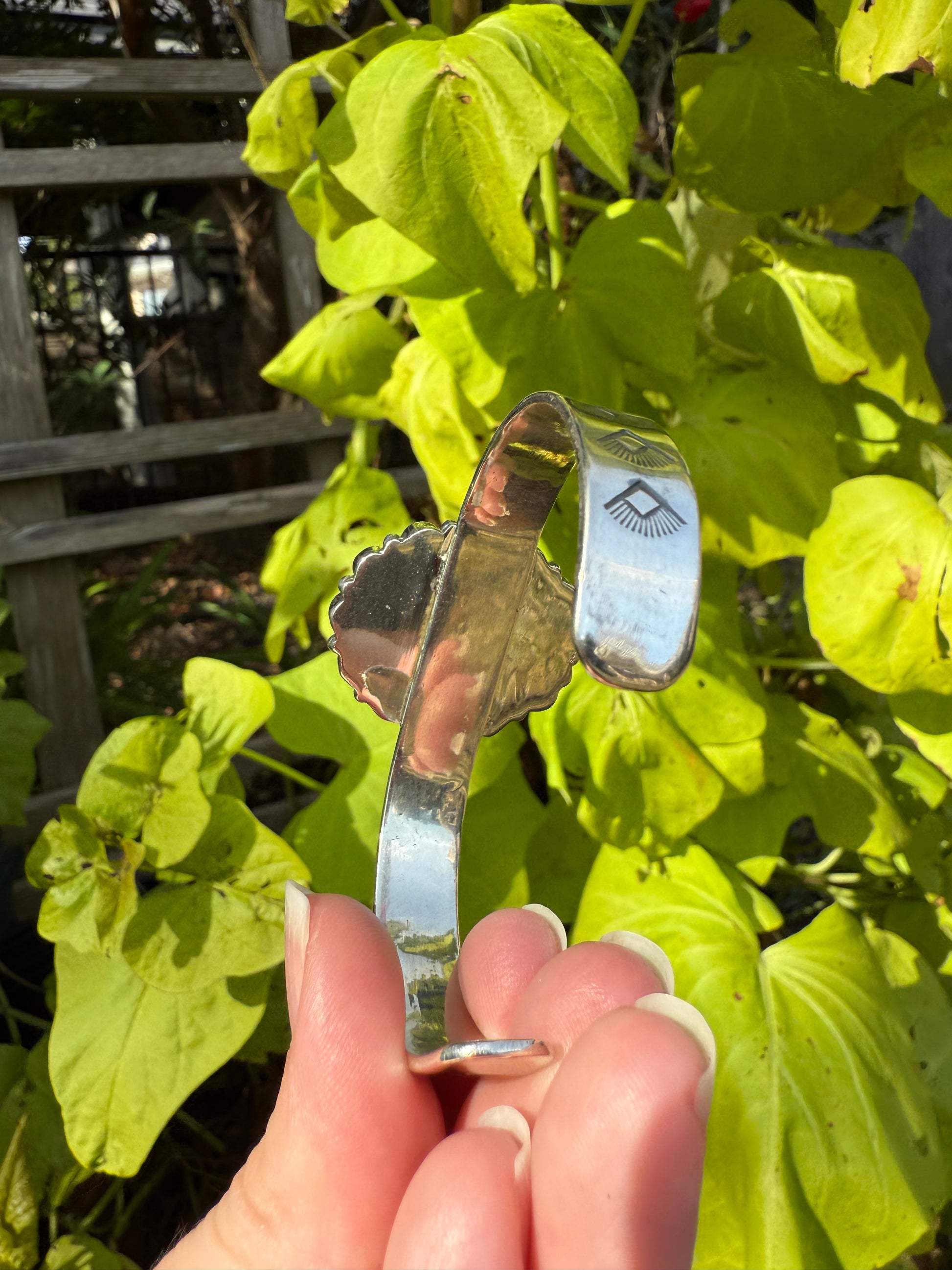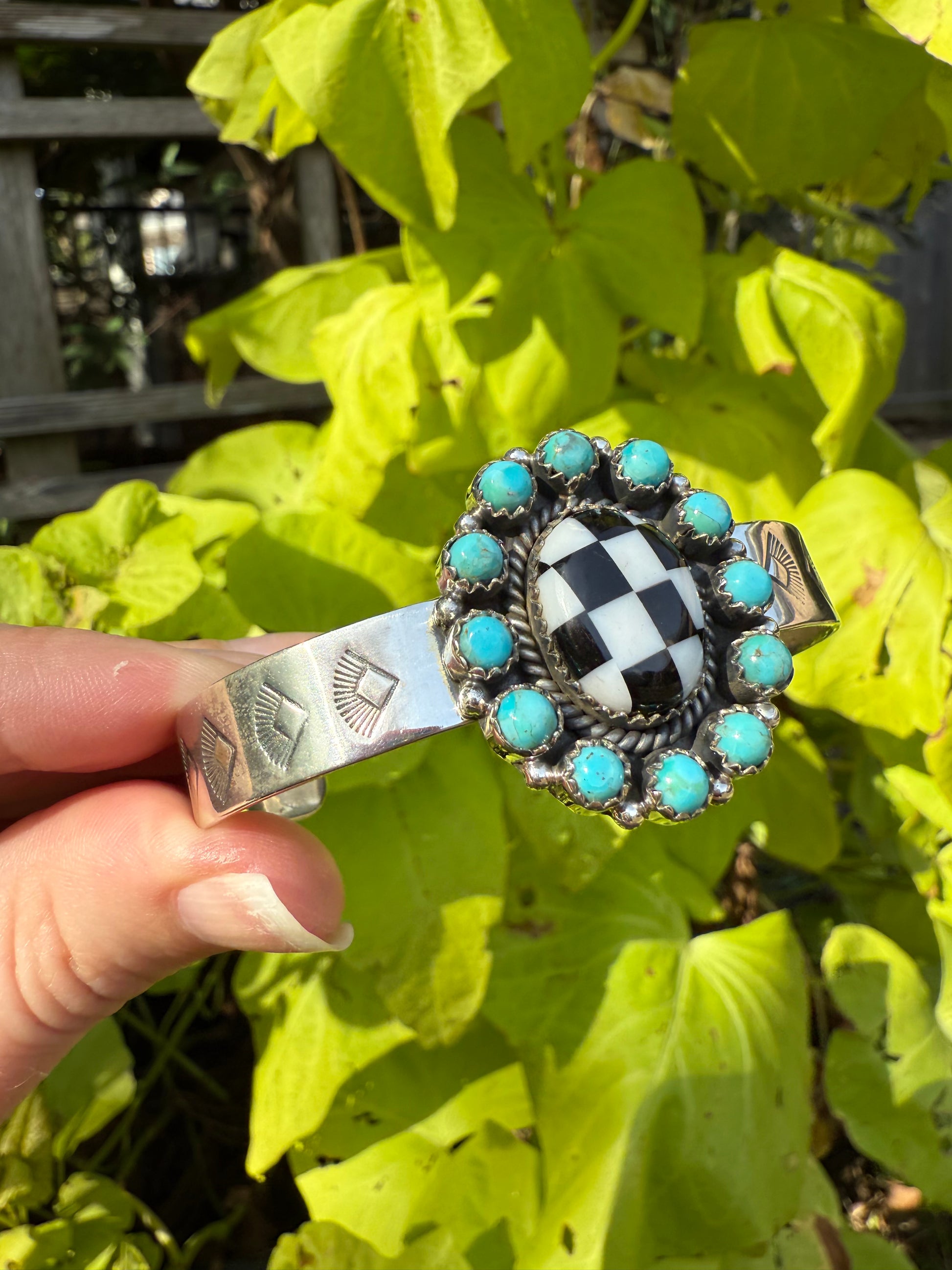 Turquoise and Checkered Flower Style Sterling Silver Cuff