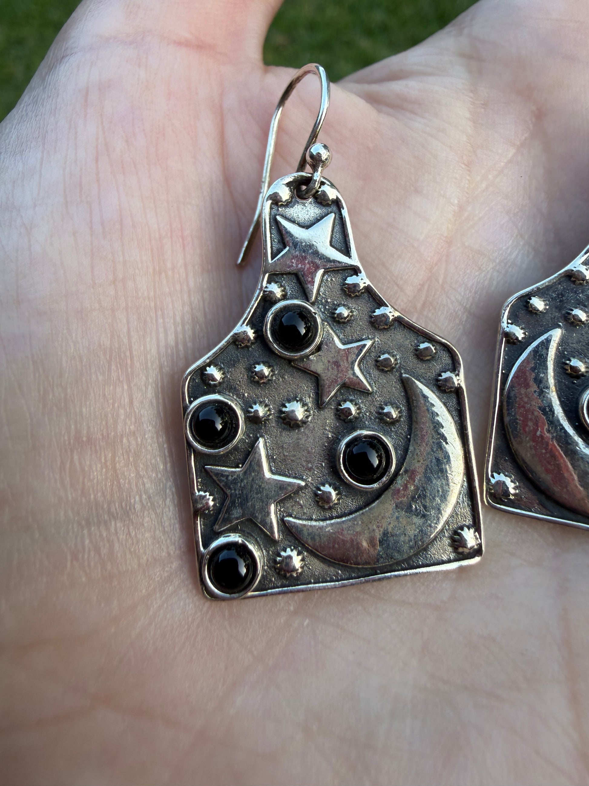 Black Onyx Star and and Moon Cow Tag Style Sterling Silver Earrings